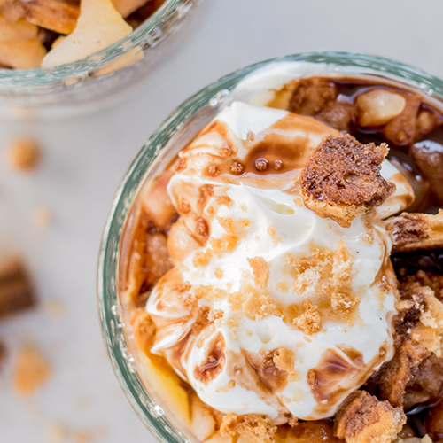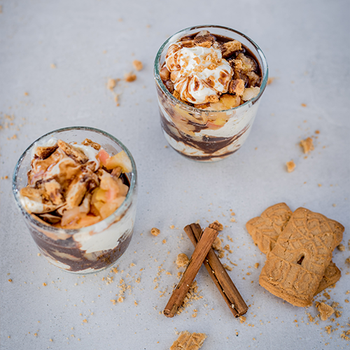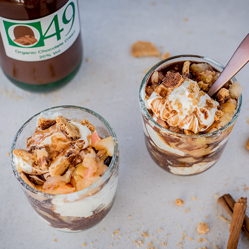 4 Gläser bereitstellen und alle Komponenten nach Wunsch schichten: Vanillecreme, Apfelkompott, Spekulatiuscrumble und O49 Organic Chocolate Cream. Direkt servieren und genießen.