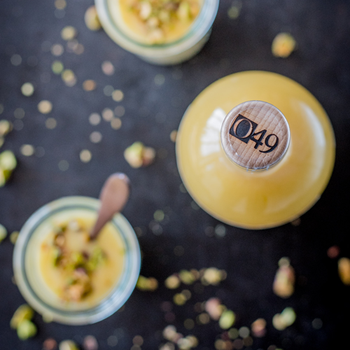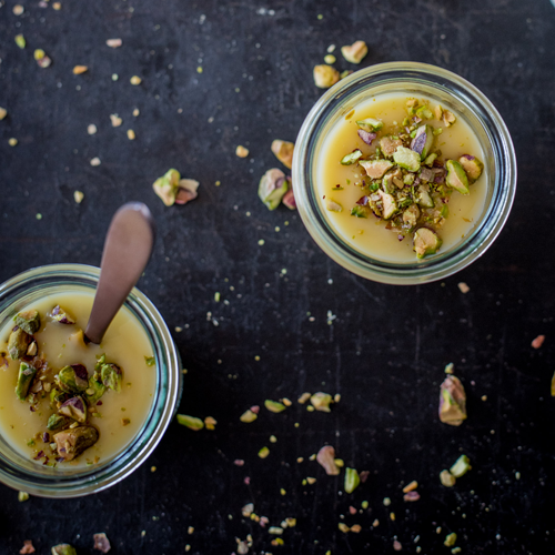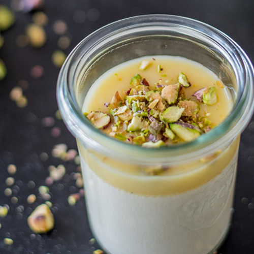 Vanille-Pannacotta mit Eierlikör und gerösteten Salz-Pistazien